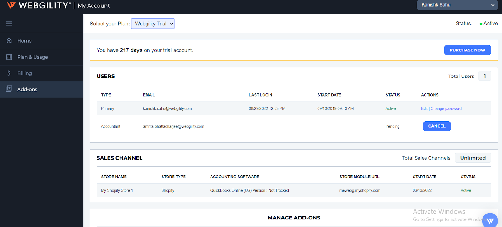 Once the accountant user has accepted the invitation, they can also be removed by the Webgility Online Subscriber in the case that the accountant user no longer works with that particular account.