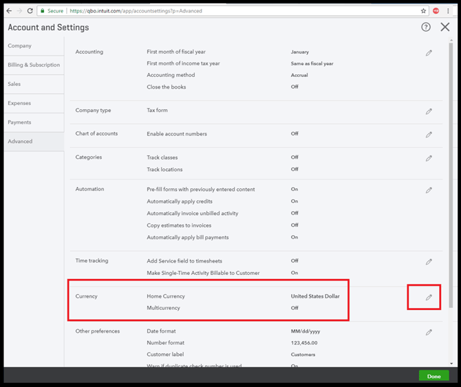 Step 4: Scroll down to the Currency section and click the Edit button(pencil icon).