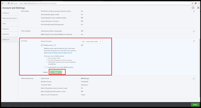 Step 5: Check the box for Multicurrency and the I understand I can't undo Multicurrency box. Then click save.