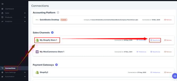 - Click Reauthorize next to the sales channel you want to update.