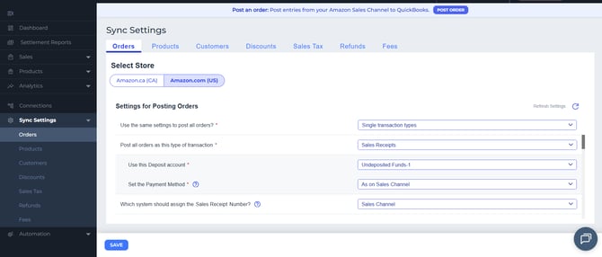 Follow the recommended steps to configure the Transaction orders posting outlined below: Go to the Sync Settings located in the lower-left navigation. Select the dropdown menu and configure the settings for each option individually.