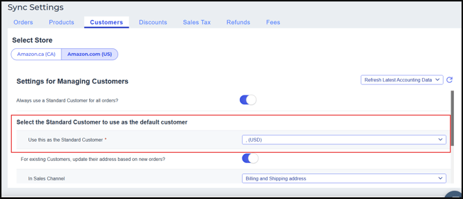 Once you've chosen the standard customer option, it's now time to select a standard customer from QuickBooks Online where you want to record the Amazon sales and refunds.