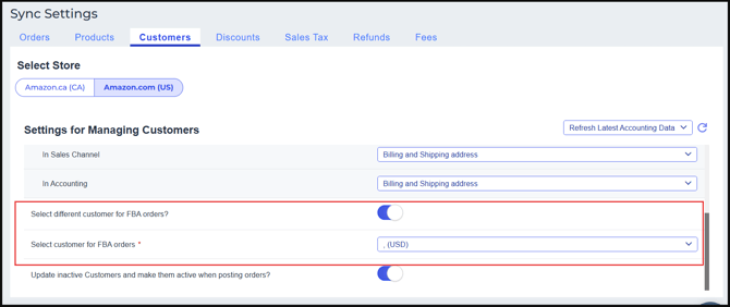 Scrolling down further, you'll see another option: 'Select a different customer for FBA orders.' This feature enables you to utilize standard customer based on FBA fulfillment channel. With this option, Webgility Online will record FBA sales separately based on the chosen customers.