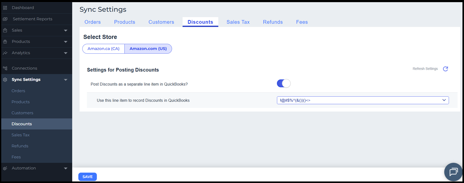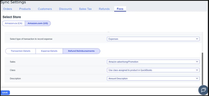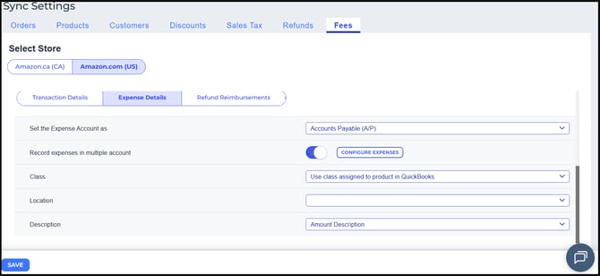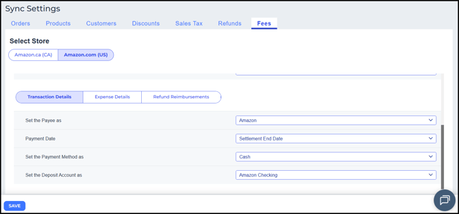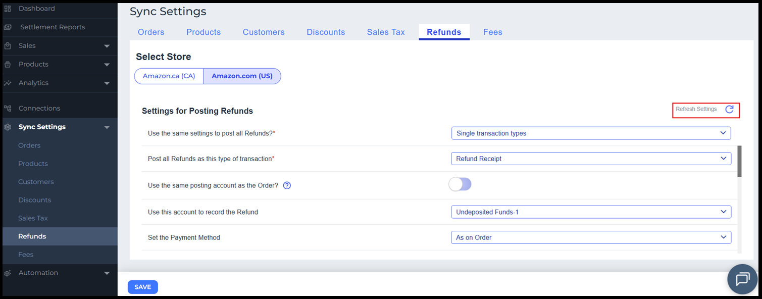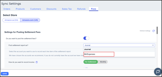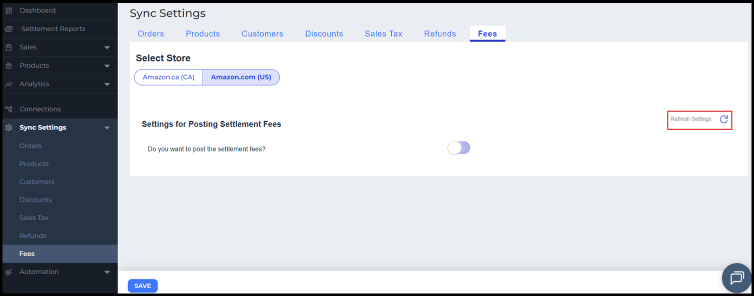 Within the Fees settings, you can adjust configurations for posting Amazon expenses and fees to QuickBooks Online. Activate the option to post settlement fees and ensure to click the refresh icon to retrieve the most recent data and settings from QuickBooks Online.