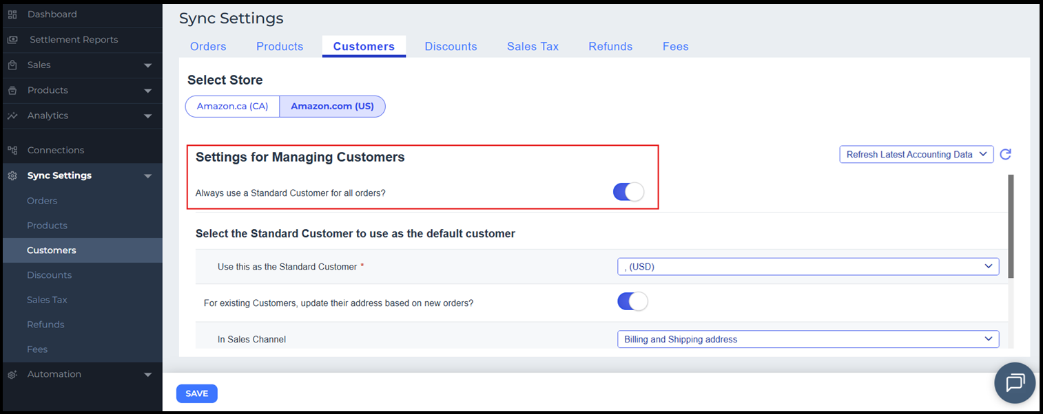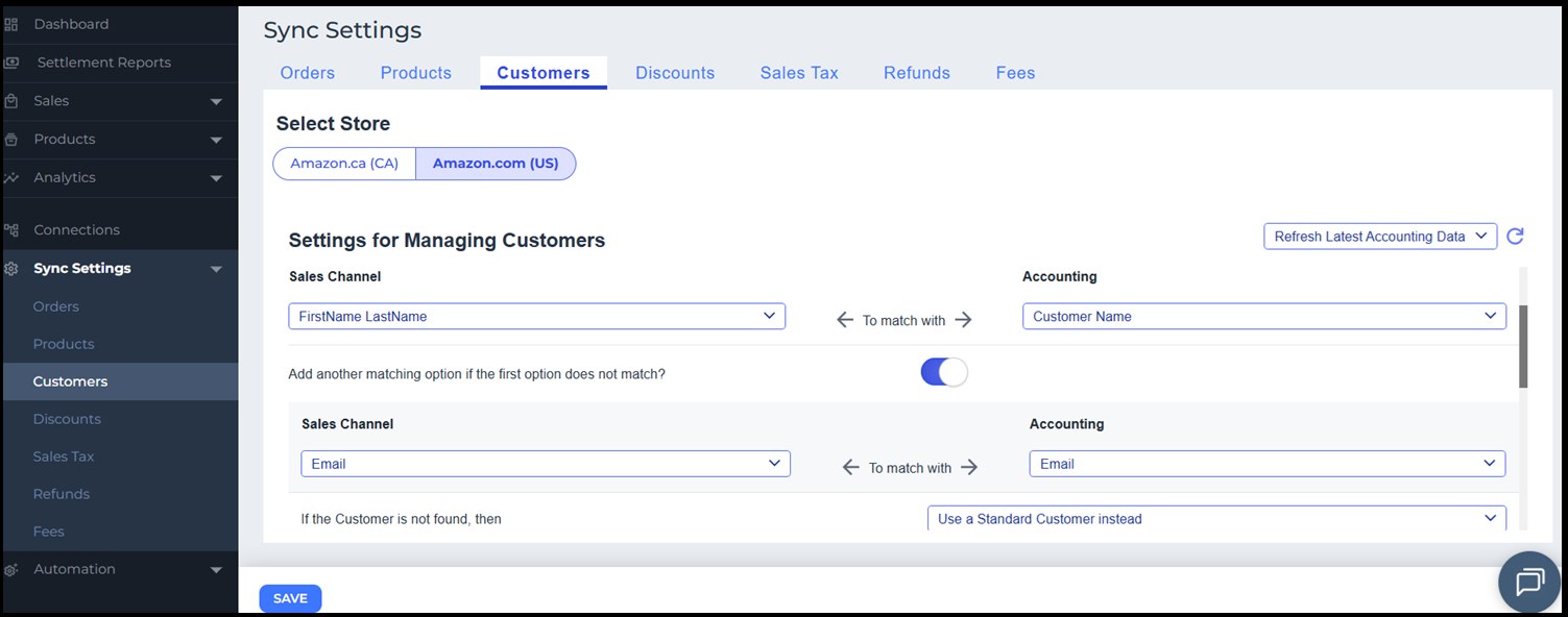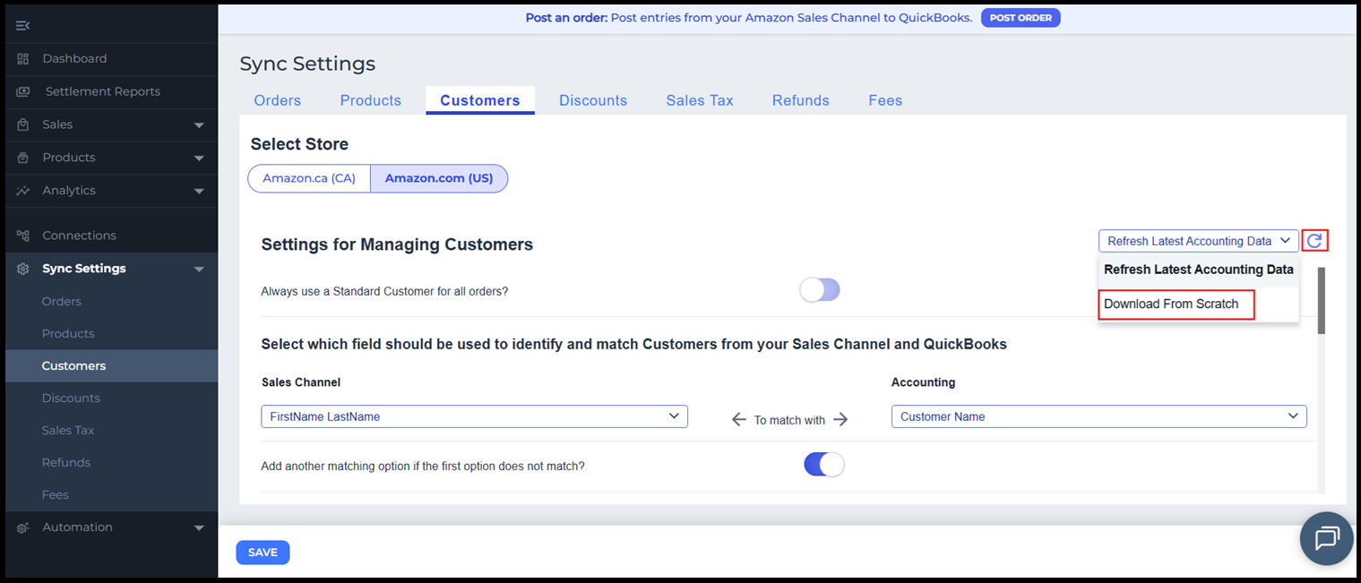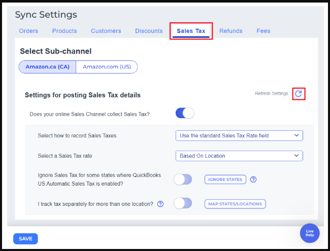 Within the Fees settings, you can adjust configurations for posting Amazon expenses and fees to QuickBooks Online. Activate the option to post settlement fees and ensure to click the refresh icon to retrieve the most recent data and settings from QuickBooks Online.