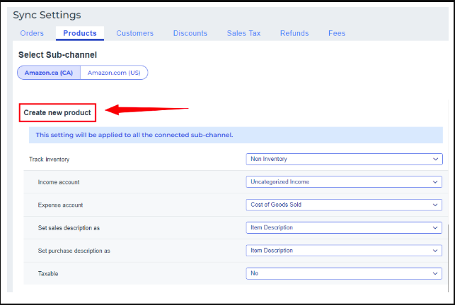The Product Settings area is where you determine your matching criteria between your sales channel and QuickBooks Online. Most commonly this is done by linking the Product SKU from the sales channel to the QuickBooks Online Item Name.