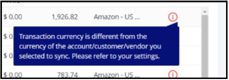 Transaction currency is different from the currency of the account/customer/vendor you selected to sync. Please refer to your settings