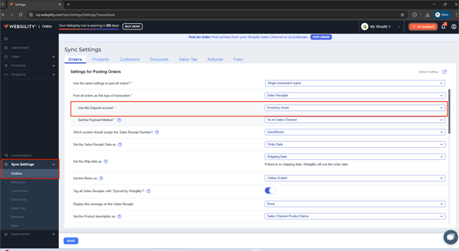 From the dashboard, navigate to the bottom-left corner and click Sync Settings > Orders and check the deposit account