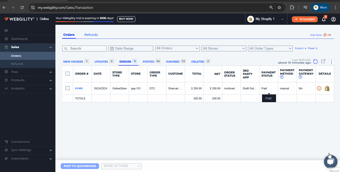 • If order posting automation is enabled and items aren't found in QuickBooks Online, Webgility Online will move those orders to the error tab.