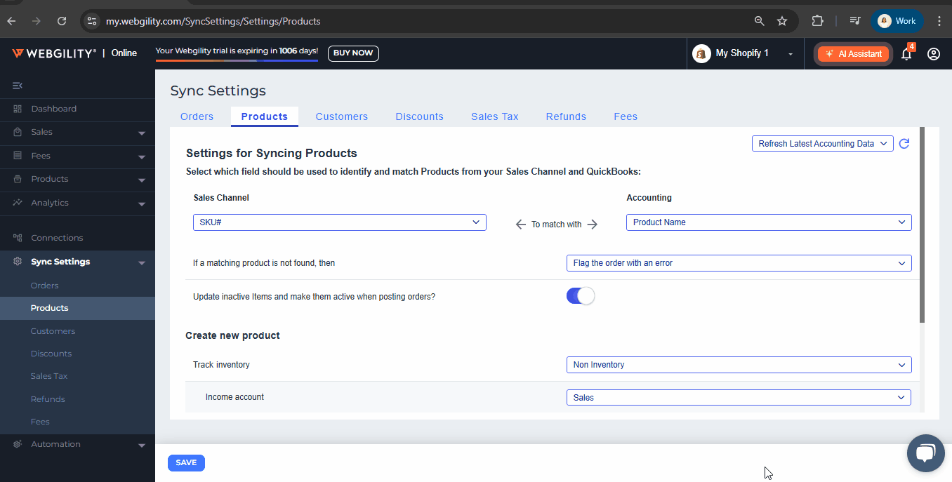 • In Webgility Online, go to Sync Settings on the bottom left-hand panel, then click on Products.