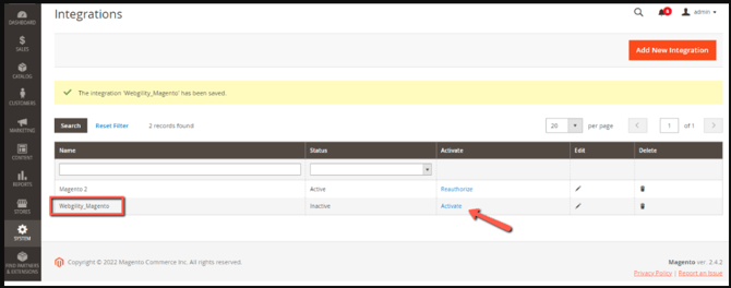 Activate the new Webgility Online integration by selecting Activate.