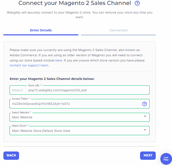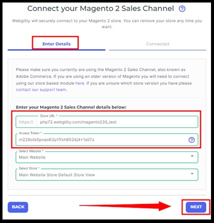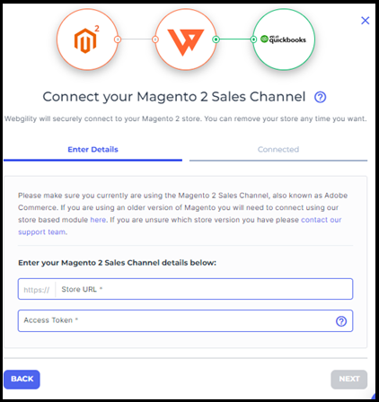 5. Once you've copied the access token, return to the Webgility Online connection process. Begin by inputting the necessary details to integrate Magento 2 and Higher with Webgility Online. Paste the Sales Channel web address, and Access Token, then continue with the Next option.