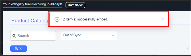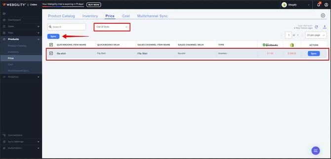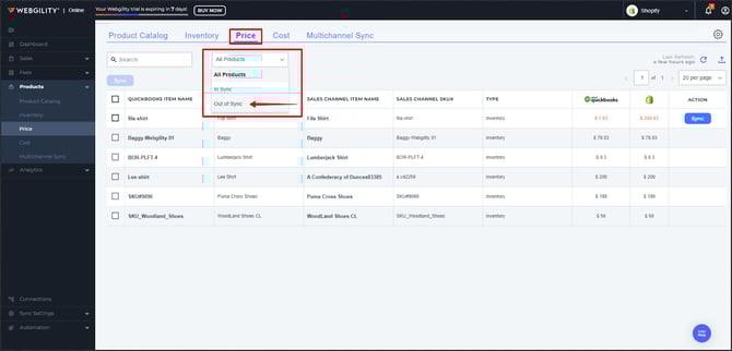 - From the dropdown menu, choose the option Out of Sync to see the out-of-sync items, in-sync items, or all the Products.