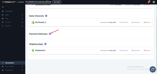 1). To connect a payment Gateway, navigate to Connections and click the ‘+’ sign next to Payment Gateways.