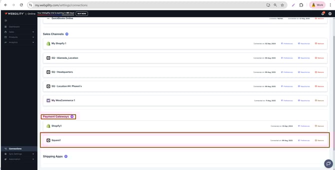 1). To connect Square, go to Connections and click the Blue plus sign next to Payment Gateways.