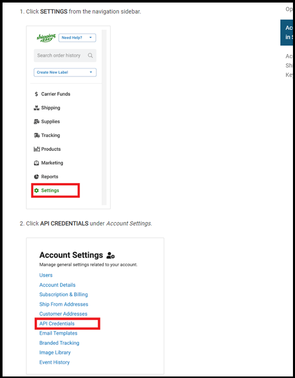 To get the API credentials from Shipping Easy, login to Shipping Easy with admin credentials and then go to Settings > API credentials, and then you will see the API key and API Secret.