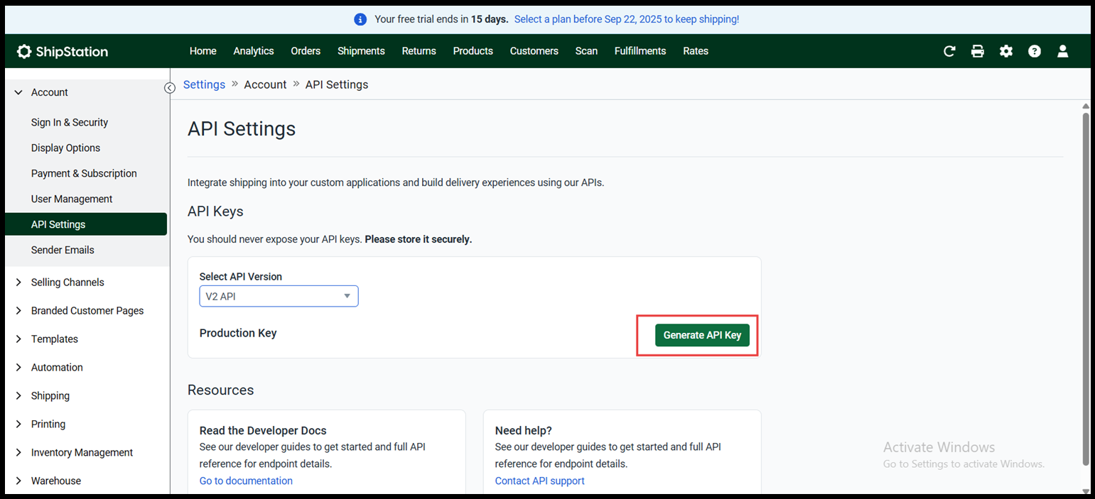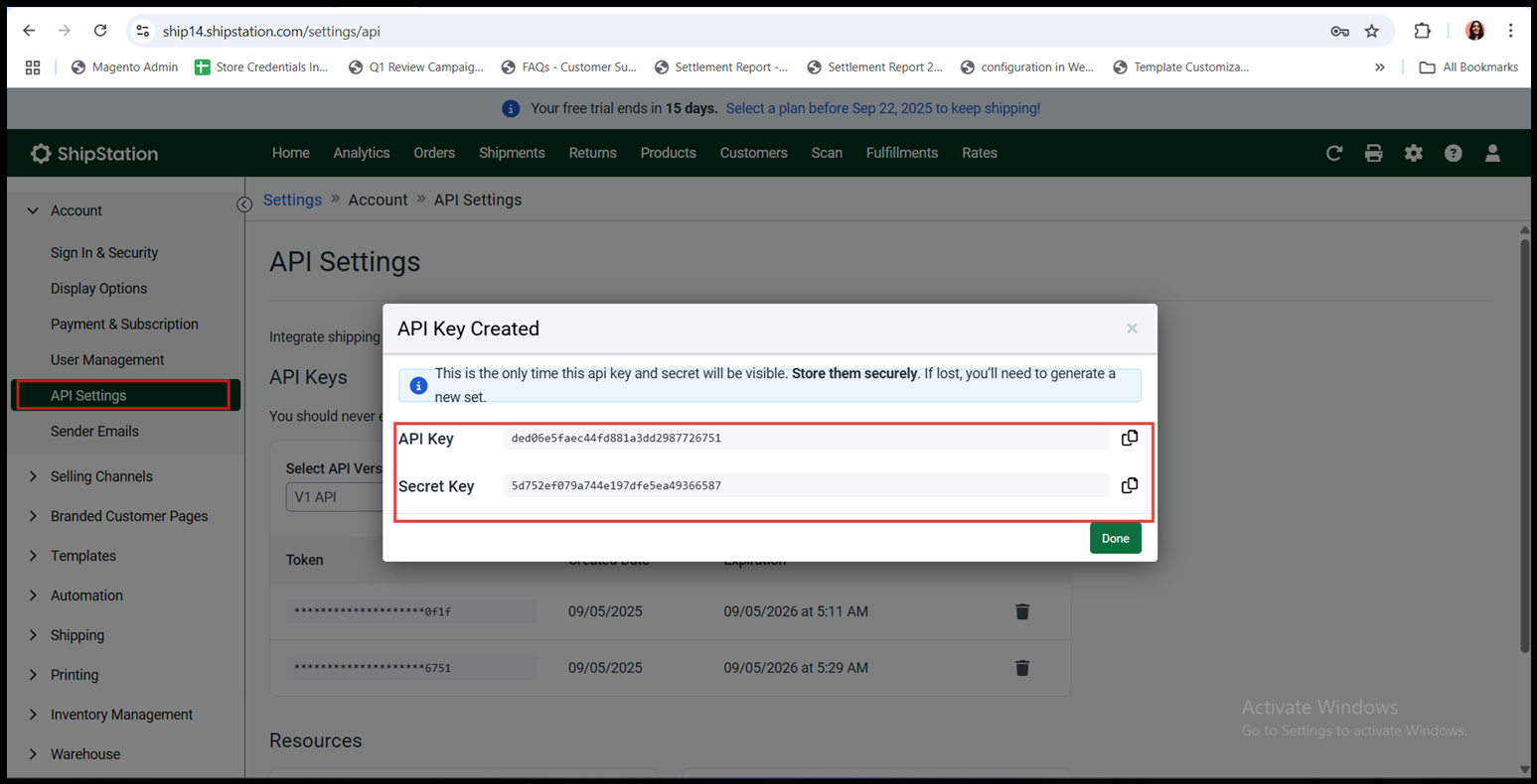 To get the API credentials from ShipStation, log in to ShipStation with admin credentials, and then go to My profile from the top right corner, then API settings > regenerate API keys, and then you will see the API key and API Secret.