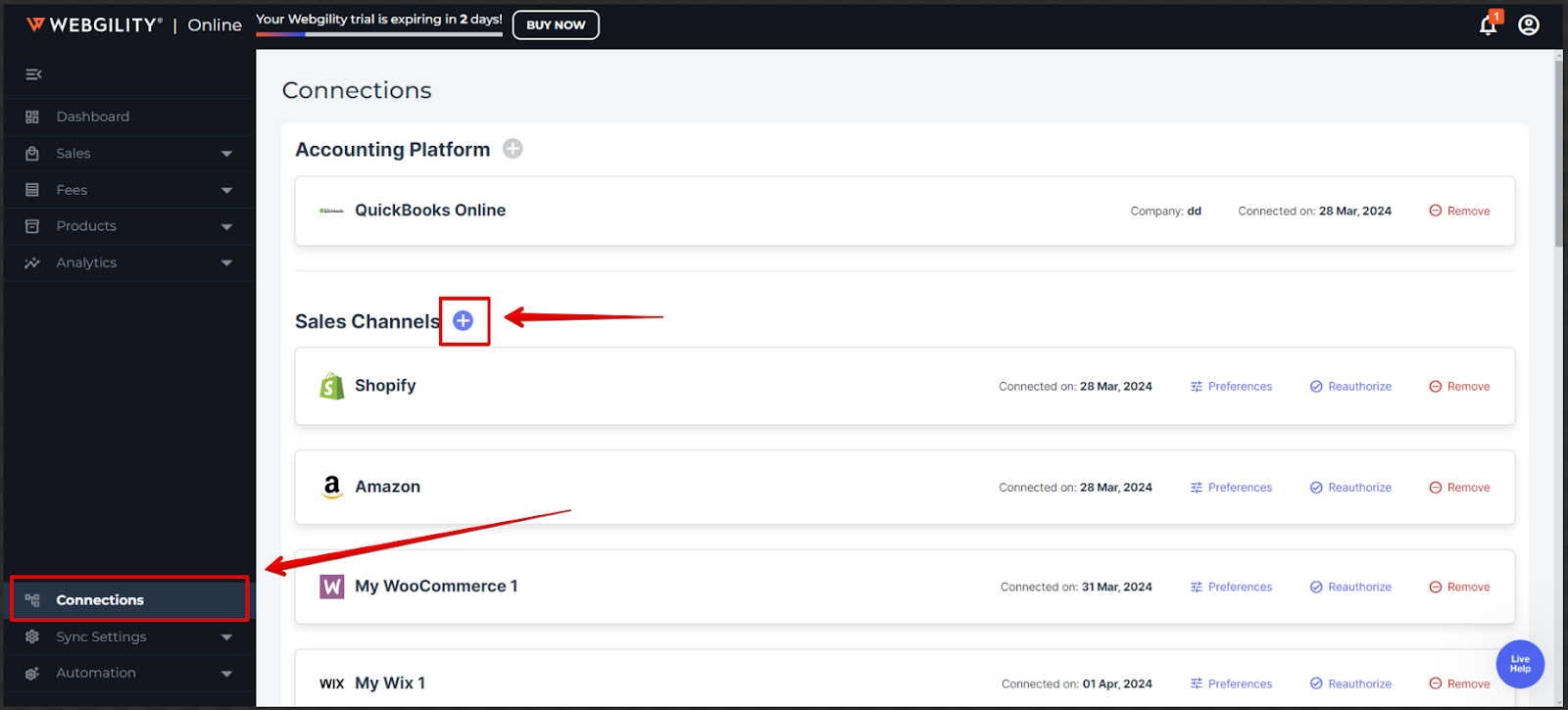 1). Go to Connections. Click the blue color Add (+) button in the Sales Channels section.