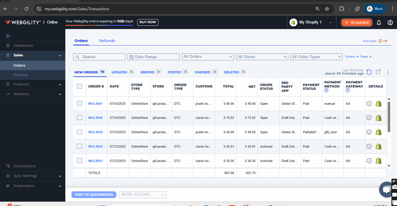 Webgility Online will now download orders or refunds from your connected sales channel according to the criteria you've set.