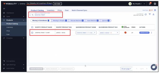If you're searching for a specific product on any of these tabs, simply enter its name or SKU in the search field, and Webgility will locate it for you.