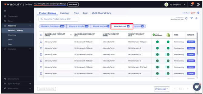 This article provides an overview of the Product Catalog and Smart Match features in Webgility Online, which serve as the central hub for managing and synchronizing product listings between sales channels (such as Shopify) and QuickBooks. The Product Catalog allows users to view, match, and manage products across several tabs—Missing in QuickBooks, Missing in Shopify, Manual Matched, and Auto Matched. Through these sections, users can identify unmatched products, manually or automatically link items using Webgility’s AI-based Smart Match, create new products directly in QuickBooks, or choose to ignore specific listings. These capabilities help ensure accurate product mapping, seamless order syncing, and consistent inventory and pricing data between Webgility, sales channels, and accounting systems.