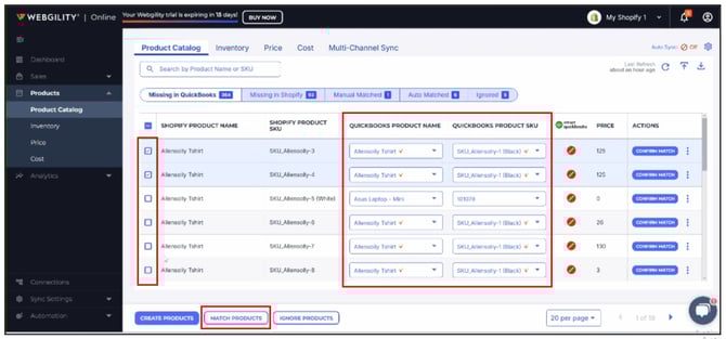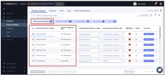 Similar to the Missing in QuickBooks tab, the Missing in Shopify tab displays all QuickBooks products that are not found in Shopify. You can choose to match or ignore them based on your preference.