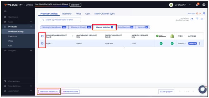 If you need to re-match a product, select the product by checking the box, then click Un-match Product. The product will be moved to the relevant missing product list, where you can rematch it.