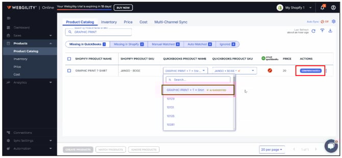 Use the search box under QuickBooks Product Name or QuickBooks Product SKU to locate the relevant product. Once you've found the right match, click Confirm Match on the right to complete the matching.
