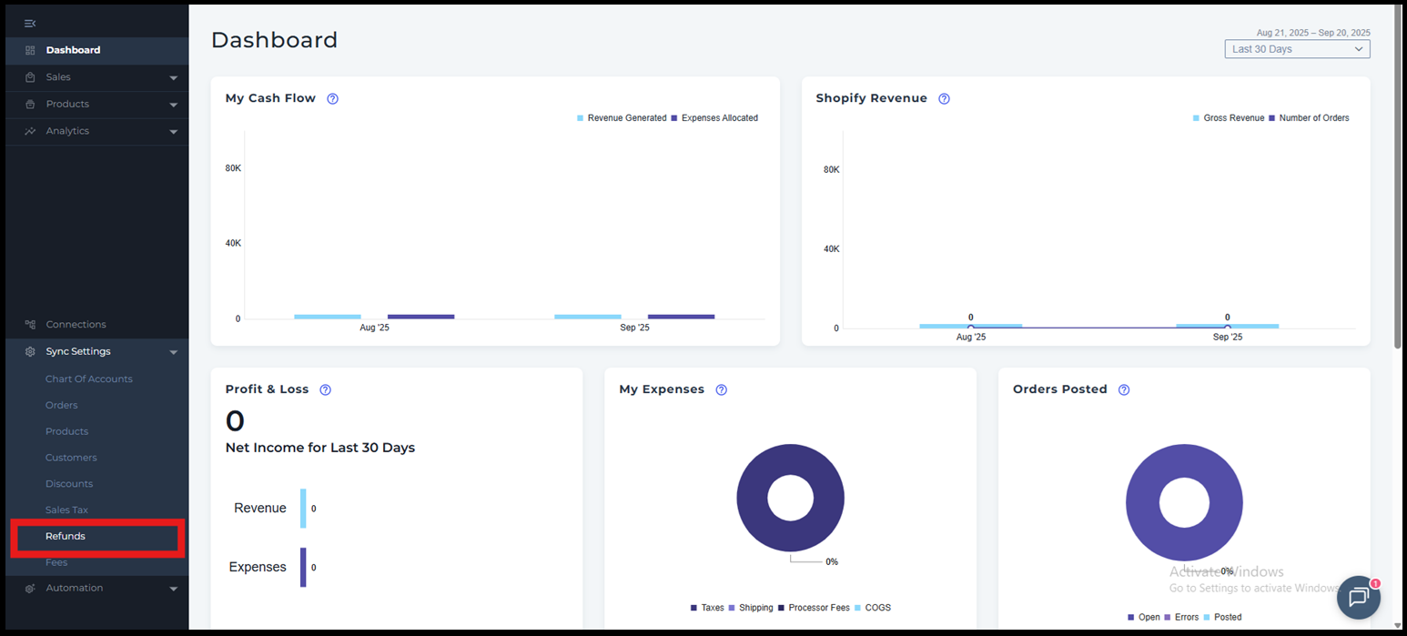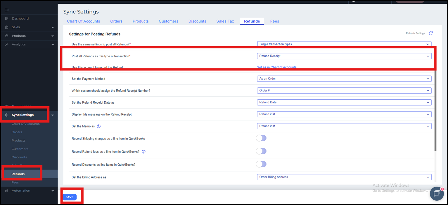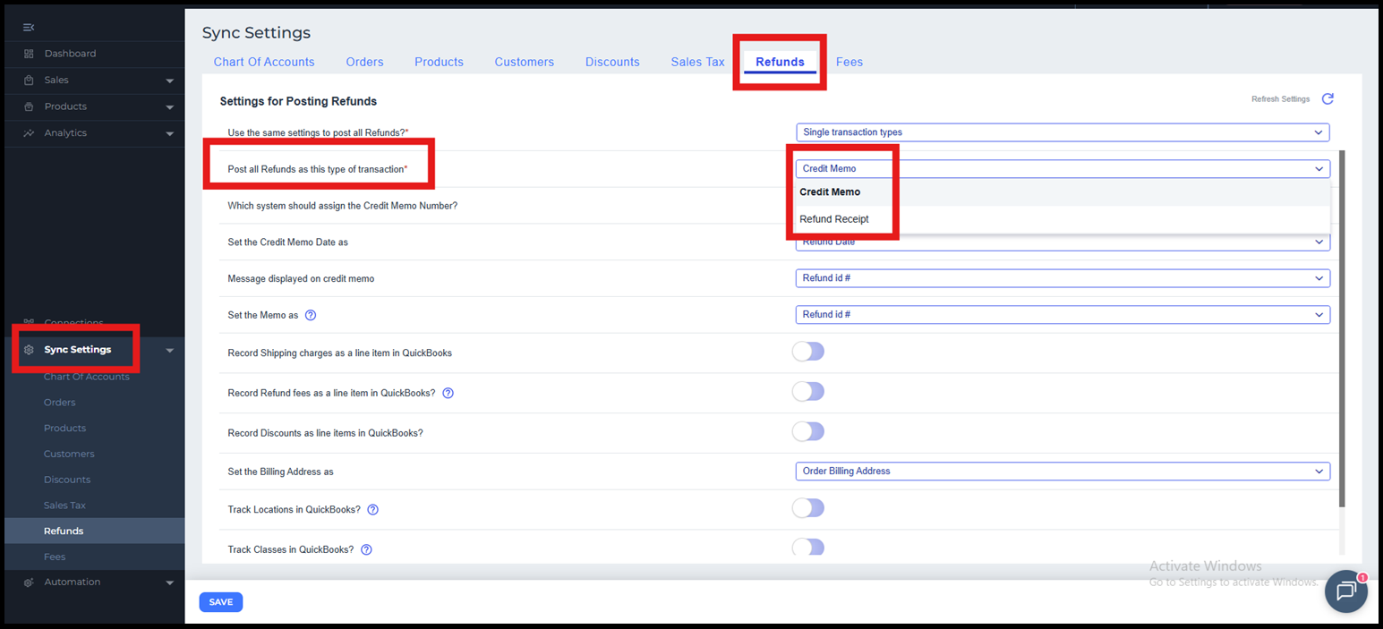 2). Navigate to Sync Settings on the bottom left-hand panel, Click on Refunds as shown in the screenshot below.