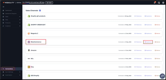 • Navigate: Connections > Sales Channel >  Reauthorize.