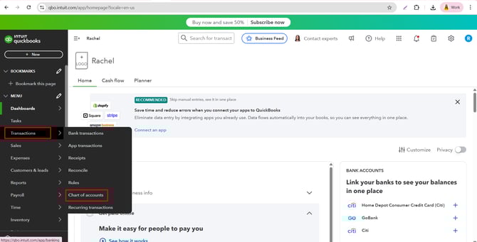 1. Login to your QuickBooks Online with Admin credentials and click on Chart of accounts.