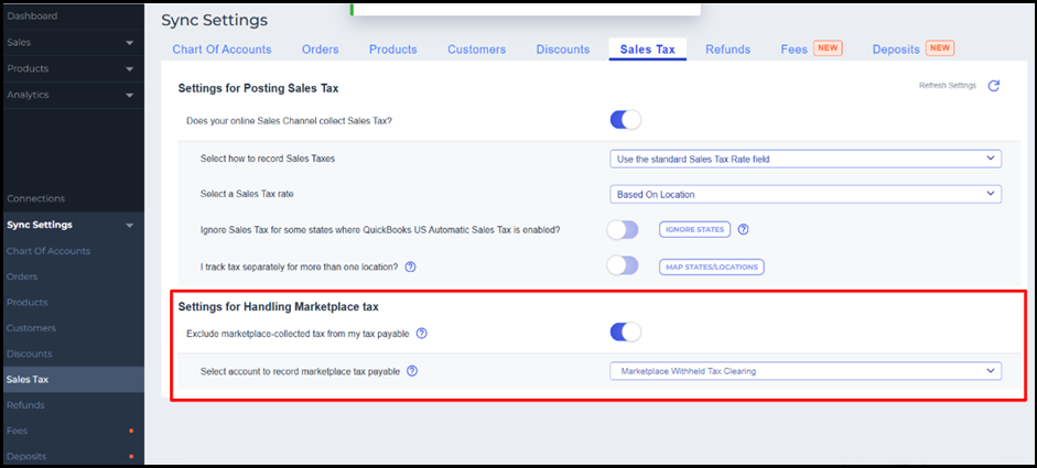 • Deducts the marketplace-collected tax from the Order Deposit Account (selected in Sync Settings>Orders), and