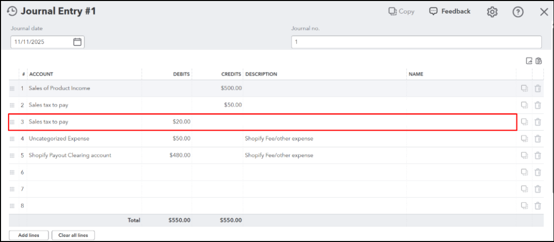 2. Webgility Online adds additional lines to your payout summary journal entry: