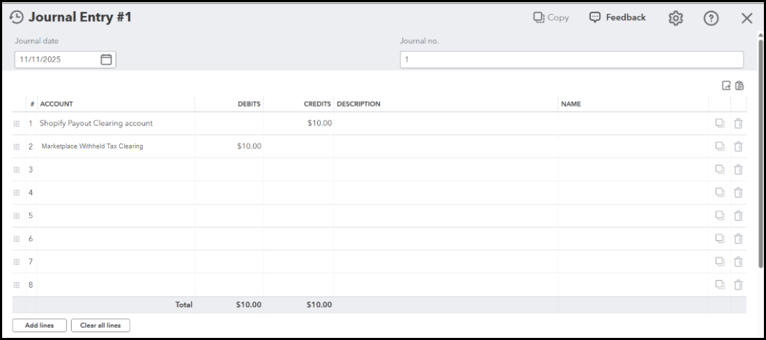 2. When the corresponding Shopify payout is received, Webgility Online posts a clearing journal entry that: