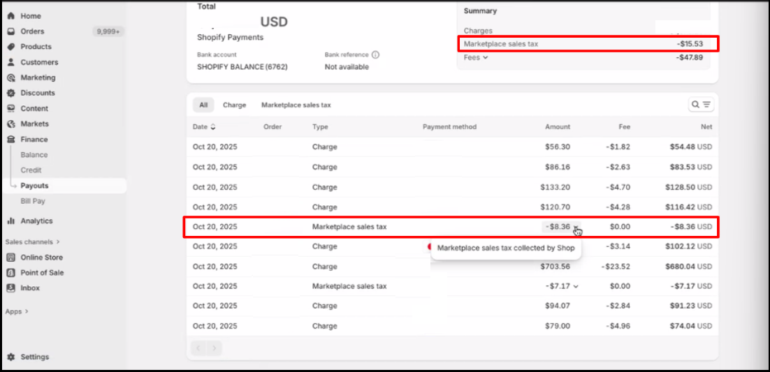 • Shopify deducts marketplace sales taxes directly from the payout,